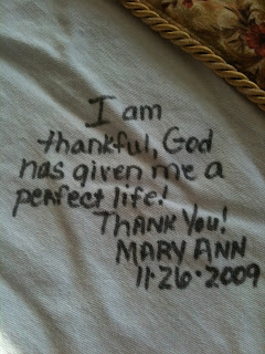 At the time I did not know, of course, how special that day would end up being.  And I did not know what a priceless gift my mom would leave me.  My mom made us a Thanksgiving tablecloth, and we write on it what we are thankful for each year.  Last year my mom wrote this: