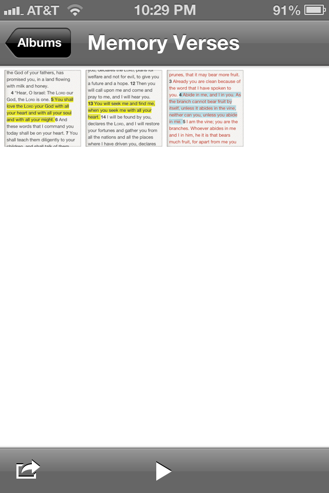 In this folder, you can swipe through all of your memory verses to review. So say you’re waiting at the doctor’s office or waiting for a friend to arrive for coffee, you can just open your Photo folder and review your memory verses. That’s a lot better use of time than playing on Facebook!