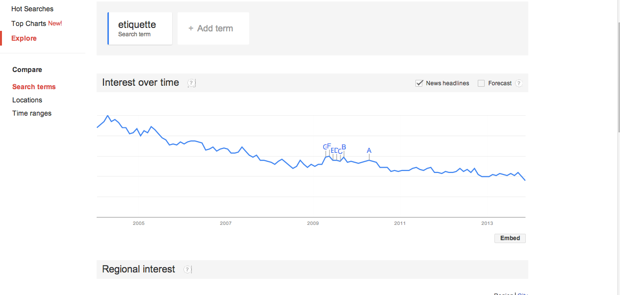 In preparing to write this post, I just did some keyword research on Google for the word “etiquette”. The graph below is what I found. But I have to wonder, even though interest in etiquette has decreased, is etiquette no longer relevant in today’s culture?