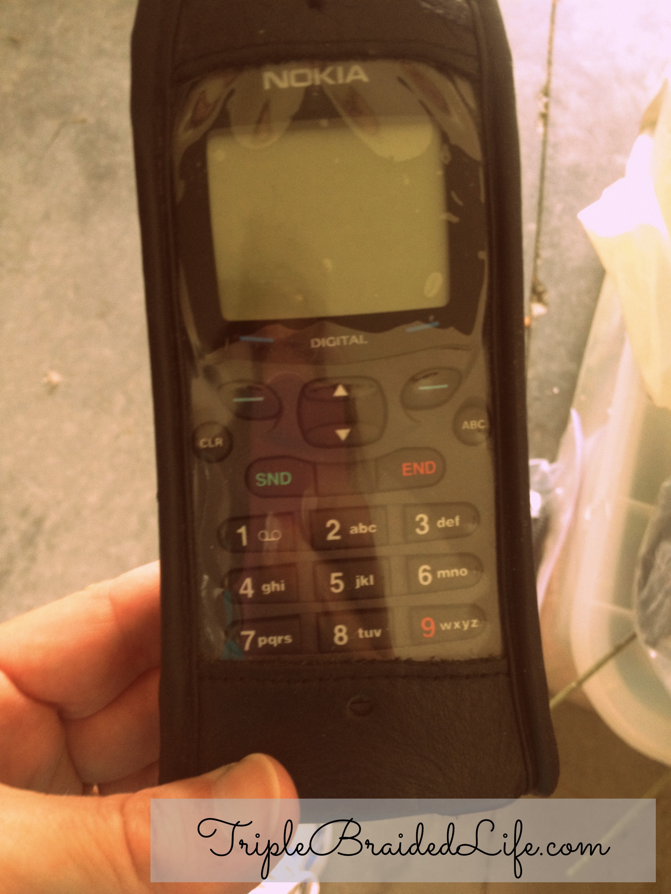 We’re getting ready for a yard sale, so I’ve been cleaning out the garage. I opened a bag stuffed on a shelf. There were about six old cell phones inside, including this one. As I shared on Instagram, if you’re younger than 29 you need to know this weighs about two pounds. My toddler girl didn’t mind though. When I walked in with six old cell phones for her to play with, she immediately found someone to “call” on each one. She’s already a little obsessed with the phone.