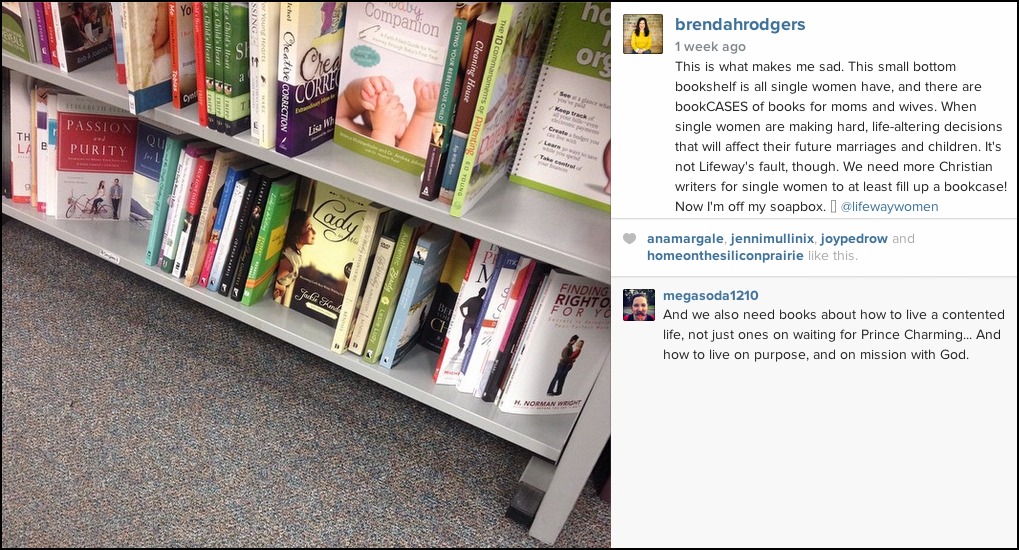 Bookshelf at LifewayI commented that this bottom shelf is the only one with books for single women. There are literally cases of books for women in general, and especially for moms, but only a handful for single women. I know it is not the bookstore’s fault. They are supplying the books that are written for single women. There just aren’t that many authors writing on singleness. This makes me sad. I wish there were more because the single years impact the futures of women, marriages, and children in significant ways that we do not address.
